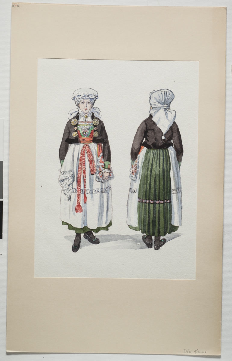 Festdräkt för gift kvinna Järrestads härad, Skåne. Akvarell av Emelie von Walterstorff.