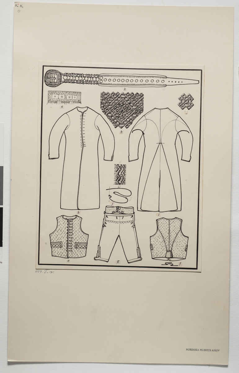Högtidsdräkt, Delsbo socken, Hälsingland. Teckning av Emelie von Walterstorff. Mansdräkt.