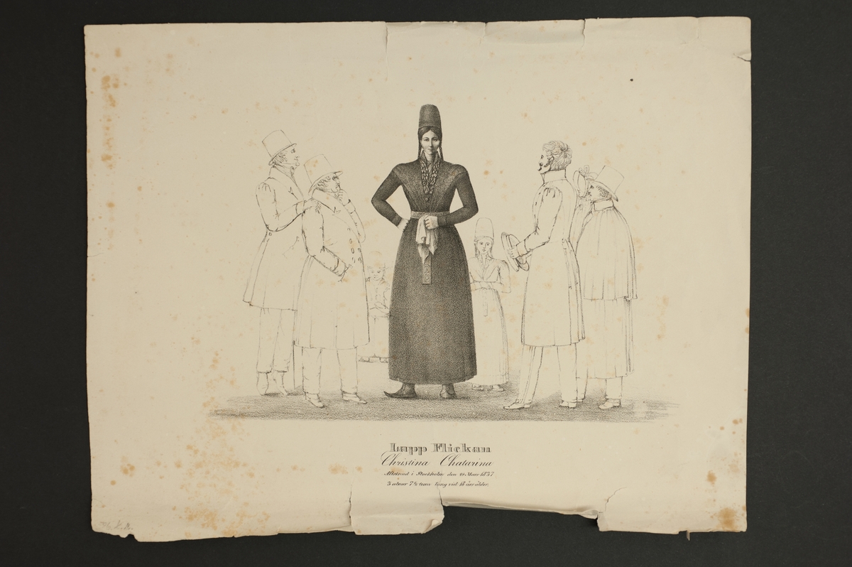 Tryck. Påskrift: "Lapp Flickan Christina Chatarina. Aftecknad i Stockholm den 24 Mars 1837. 3 alnar 7 1/2 tum lång vid 18 års ålder." Porträtt av kvinna i en folkmassa. L.A. 865