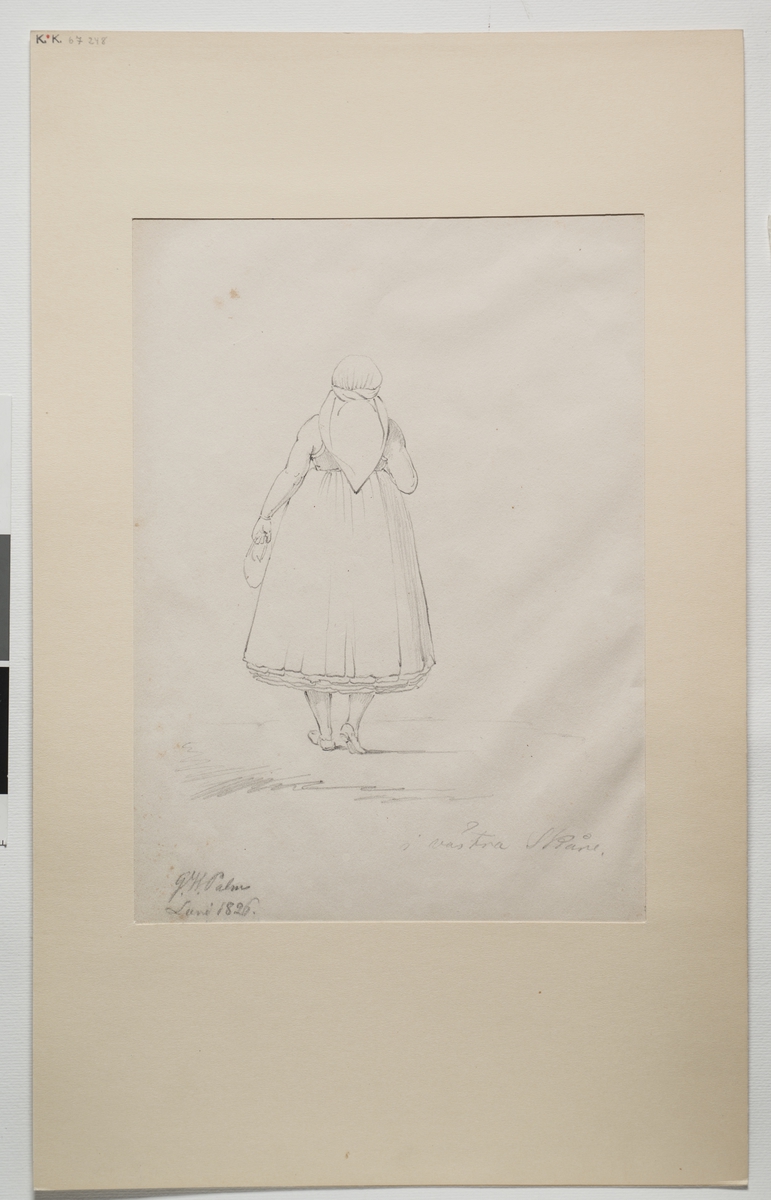 Teckning föreställande kvinna bakifrån. Lund, Skåne, 1826.