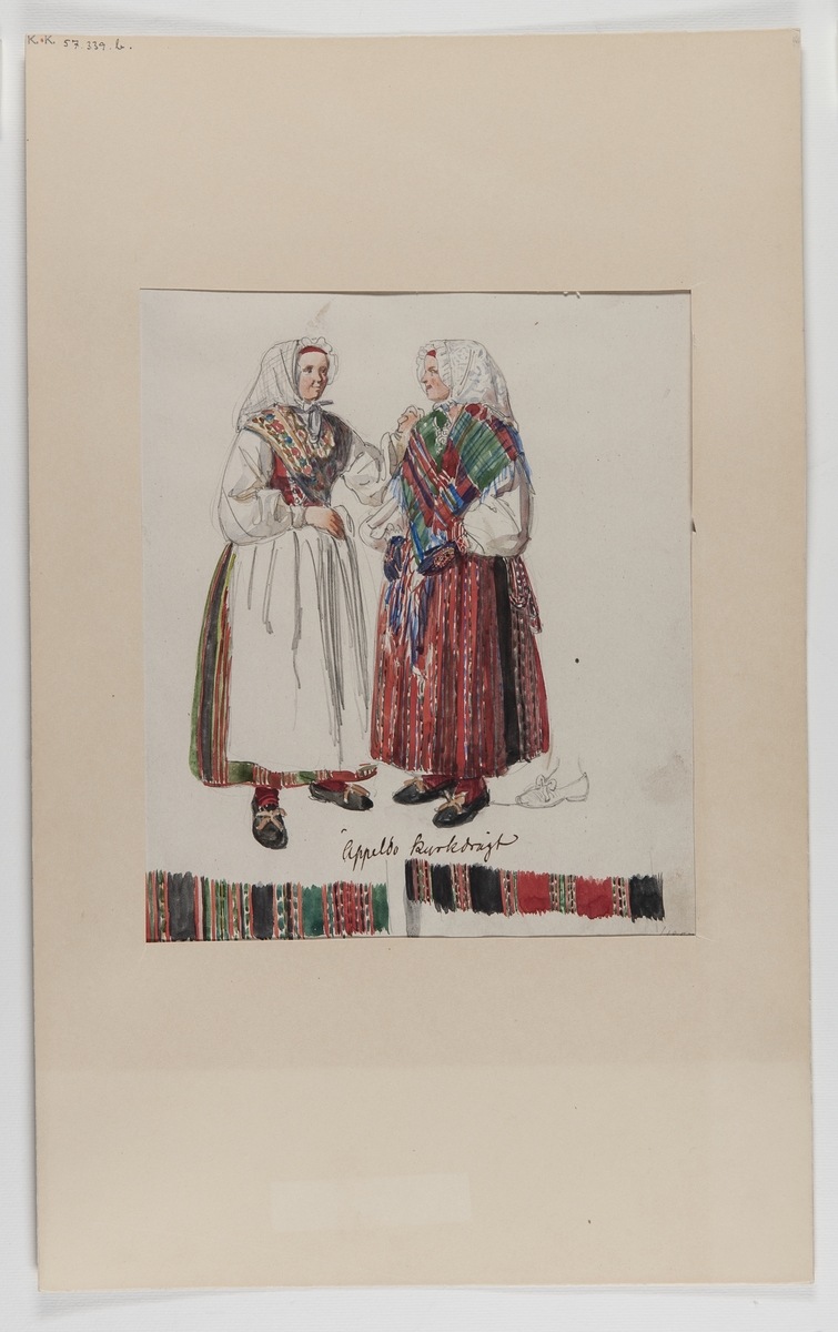 Akvarellerad handteckning av J W Wallander. Kvinnodräkter från Äppelbo, Dalarna. Text: "Äppelbo kyrkdrägt". Nordiska museeets inventarienummer 57339b.
