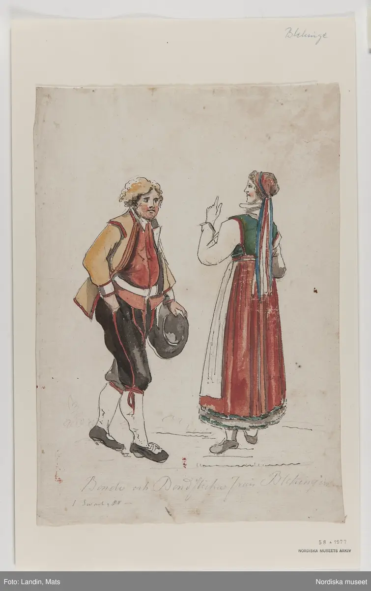 Akvarellerad teckning. Mans- och kvinnodräkter från Blekinge. "Bonde och bondflicka från Blekinge".