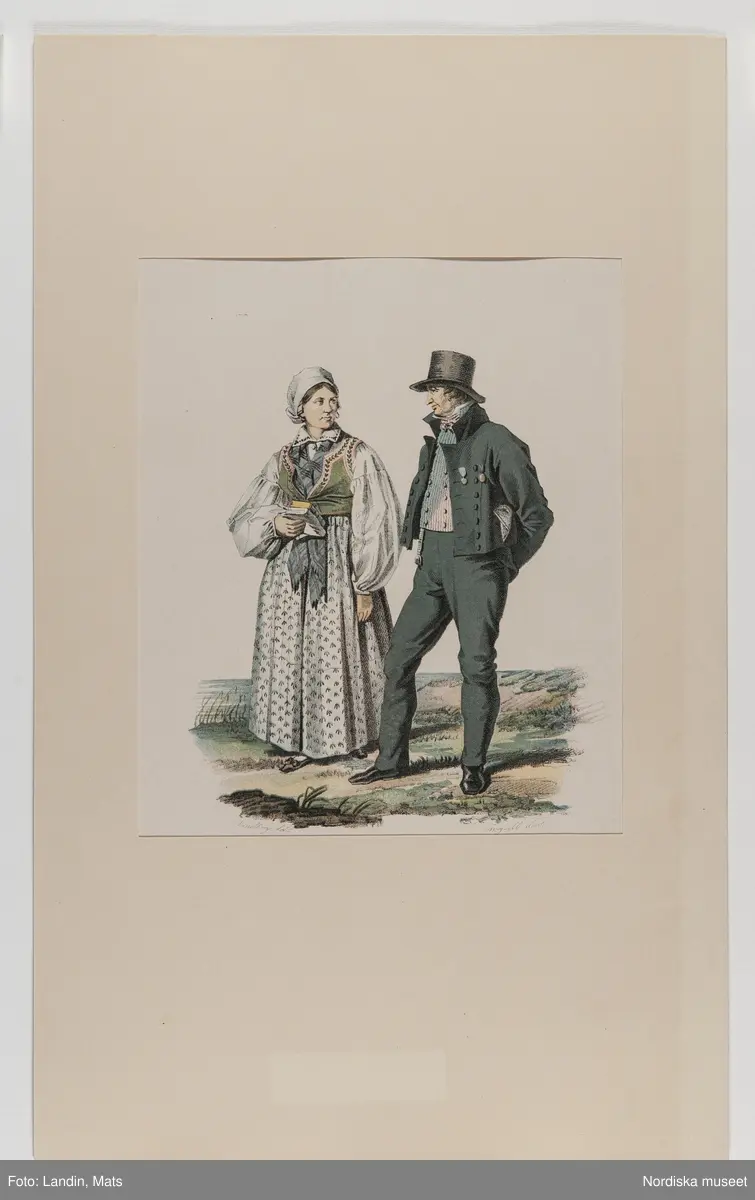 Bildtryck i färger. Mans- och kvinnodräkter från Bekinge, Jämjö sn. Jmfr NMA.0035435.