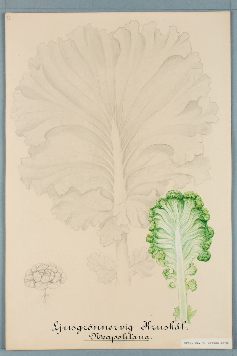 Sveriges kulturväxter. Illustration utförd av Henriette Sjöberg. Kruskål, ljusgrönnervig, Neapolitana. Odlad Ultuna 1878. Inv. nr. C101 : 358.