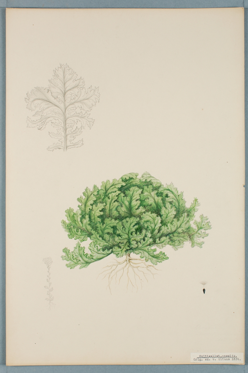 Sveriges kulturväxter. Illustration utförd av Henriette Sjöberg. Snittsallat, mosslik. Odlad Ultuna 1876. Inv. nr. C101 : 416.