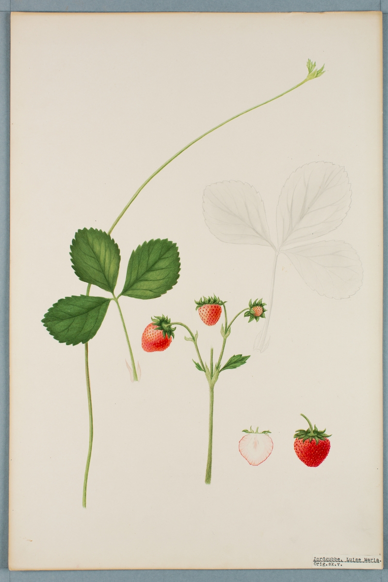 Sveriges kulturväxter. Illustration utförd av Henriette Sjöberg. Jordgubbe, Luise Maria. Odlingsplats och datering saknas. Signerad "H.S.".