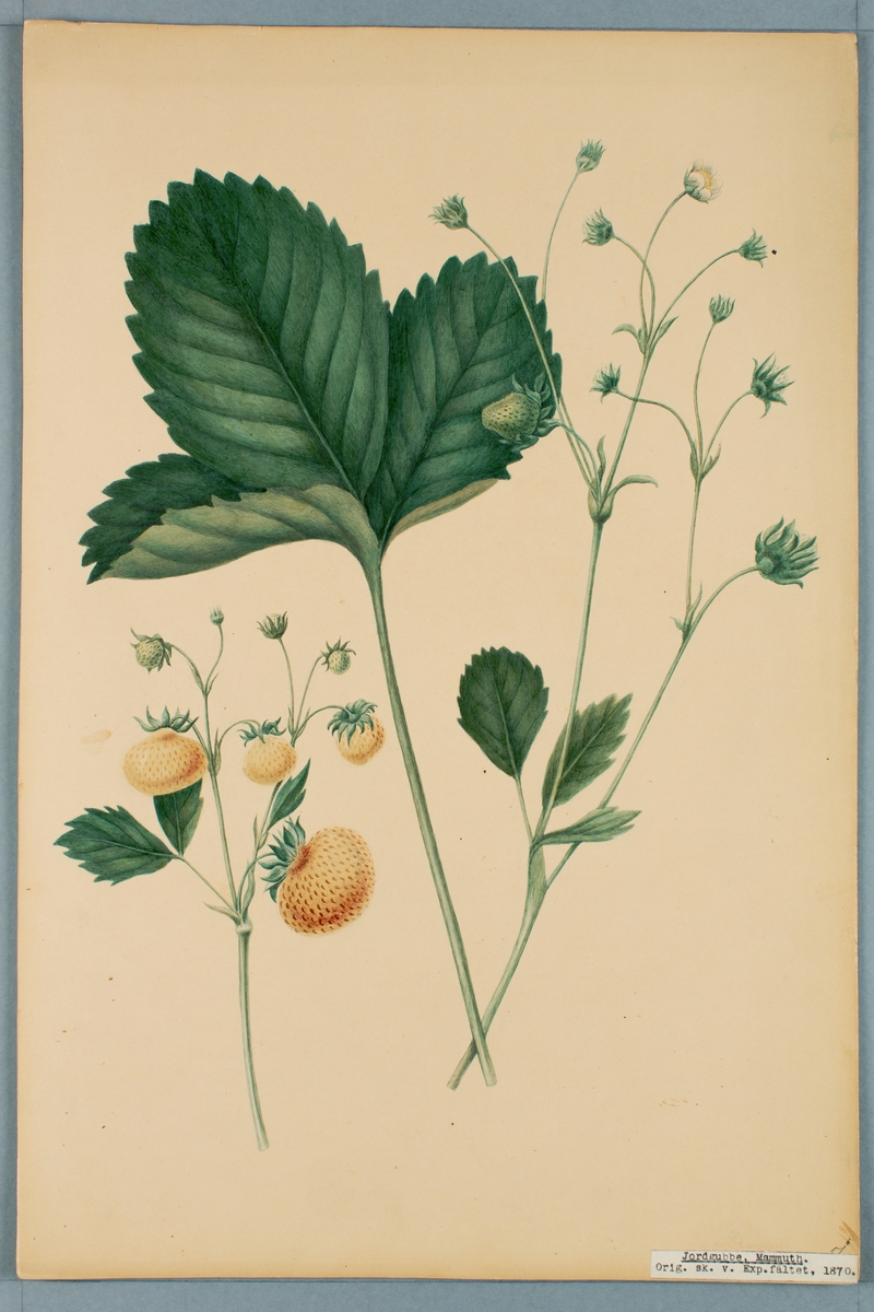 Sveriges kulturväxter. Illustration utförd av Henriette Sjöberg. Jordgubbe, Mammuth. Odlad Experimentalfältet 1870.