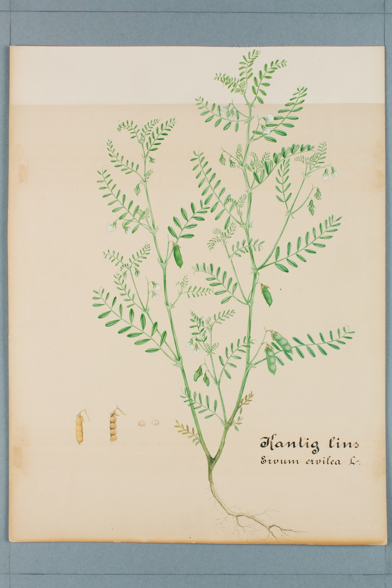 Sveriges kulturväxter. Illustration utförd av Henriette Sjöberg. Kantig lins. Odlingsplats och datering saknas.