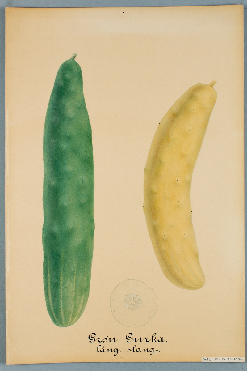 Sveriges kulturväxter. Illustration utförd av Henriette Sjöberg. Gurka, lång, Slanggurka. Odlad Äs, Södermanland 1876. Inv. nr. C101 : 500.