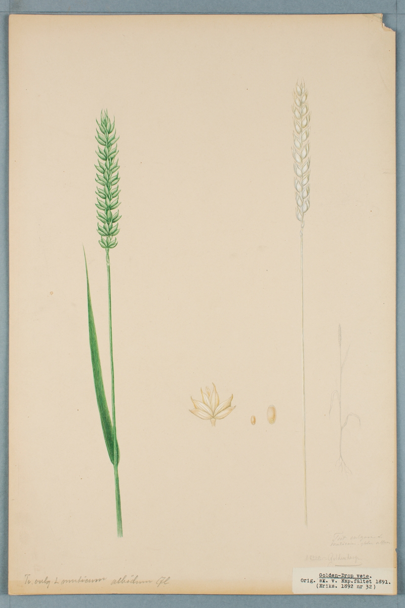 Sveriges kulturväxter. Illustration utförd av Henriette Sjöberg. Vete, Golden Drop. Odlat Experimentalfältet 1891. Eriksson 1892, nr. 32. Inv. nr. C101 : 45.