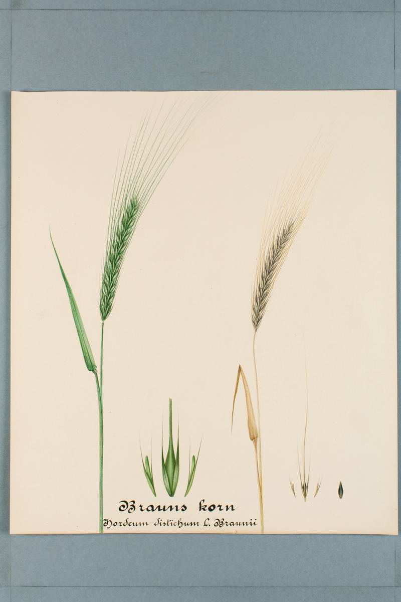 Sveriges kulturväxter. Illustration utförd av Henriette Sjöberg. Korn, Brauns. Odlat Experimentalfältet 1888 (uppgift om datering saknas på arket). Signerad "Exper 1891" (beskuren). Jämför NMA.0098622.