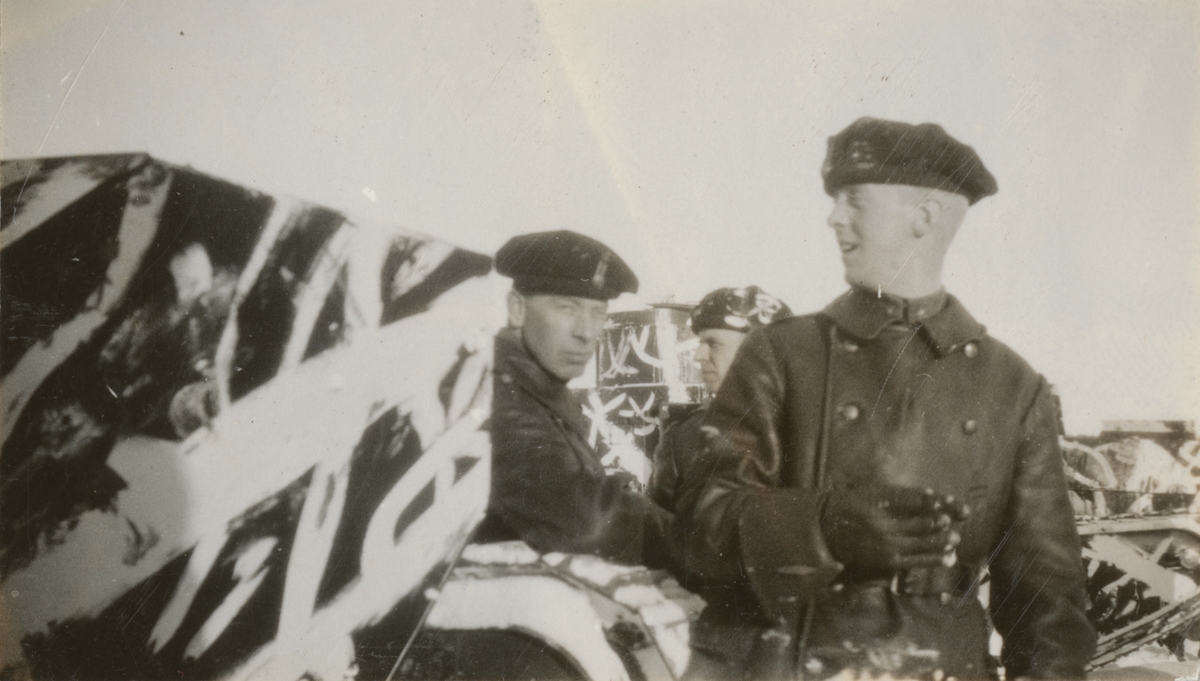 Tre elever från Göta livgardes stridsvagnskurs framför stridsvagn m/1921 (eller m/1921-1929) på vinterövning i Boden. Närmast kamera löjtnant Erik de Maré Dalregementet I 13 och löjtnant Gunnar Asklin Bohusläns regemente I 17.