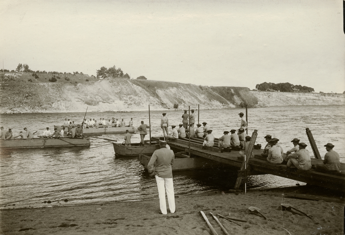 Titel: Elever från Krigsskolan Karlberg bygger pontonbro över vattendrag.