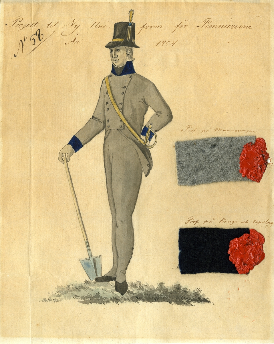 Akvarell med uniformsskiss "projekt till ny uniform för pionjärerna år 1804". Med fastlimmade tygprover till uniformsmundering.