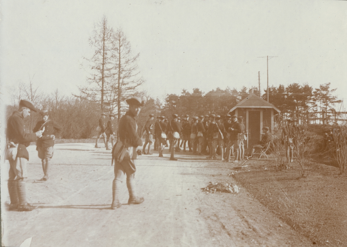 Titel: Soldater samlas vid station efter avslutad infanteriövning.