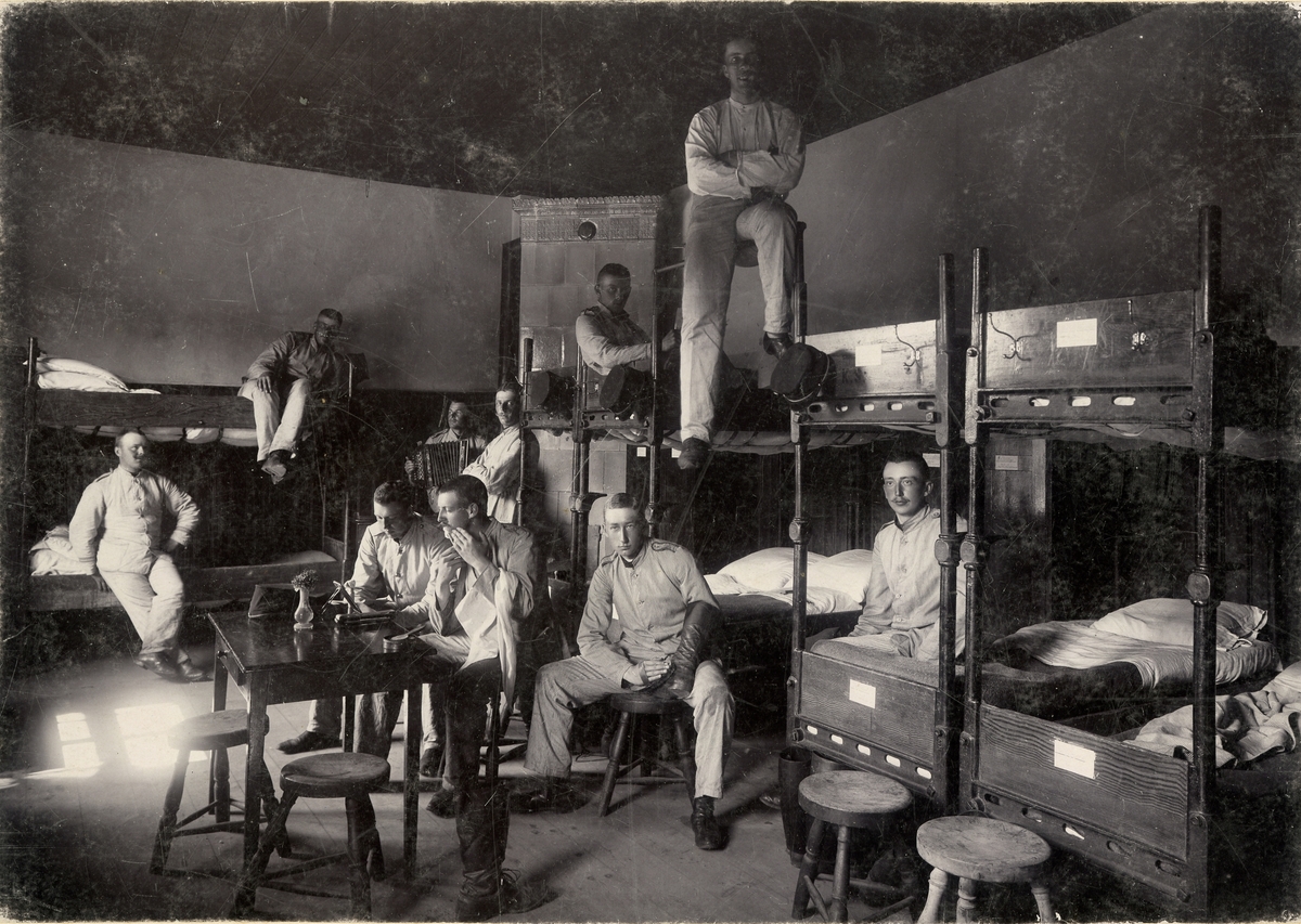 Titel: Volontärer i ledig klädsel i logement 1890-tal. Krigsskolan Karlberg.
