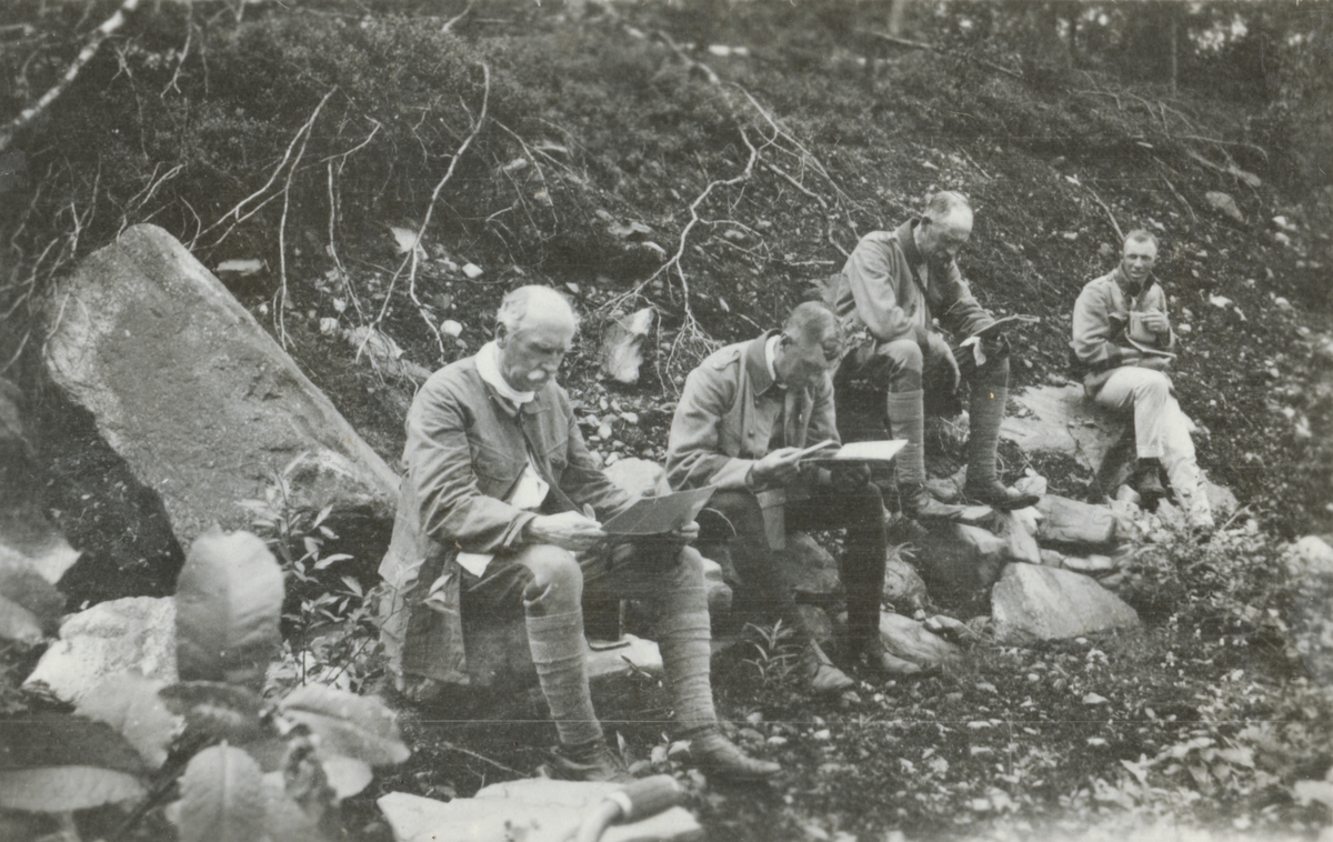 Titel: Bildtext: "Orientering". En grupp män studerar kartor i skogen.