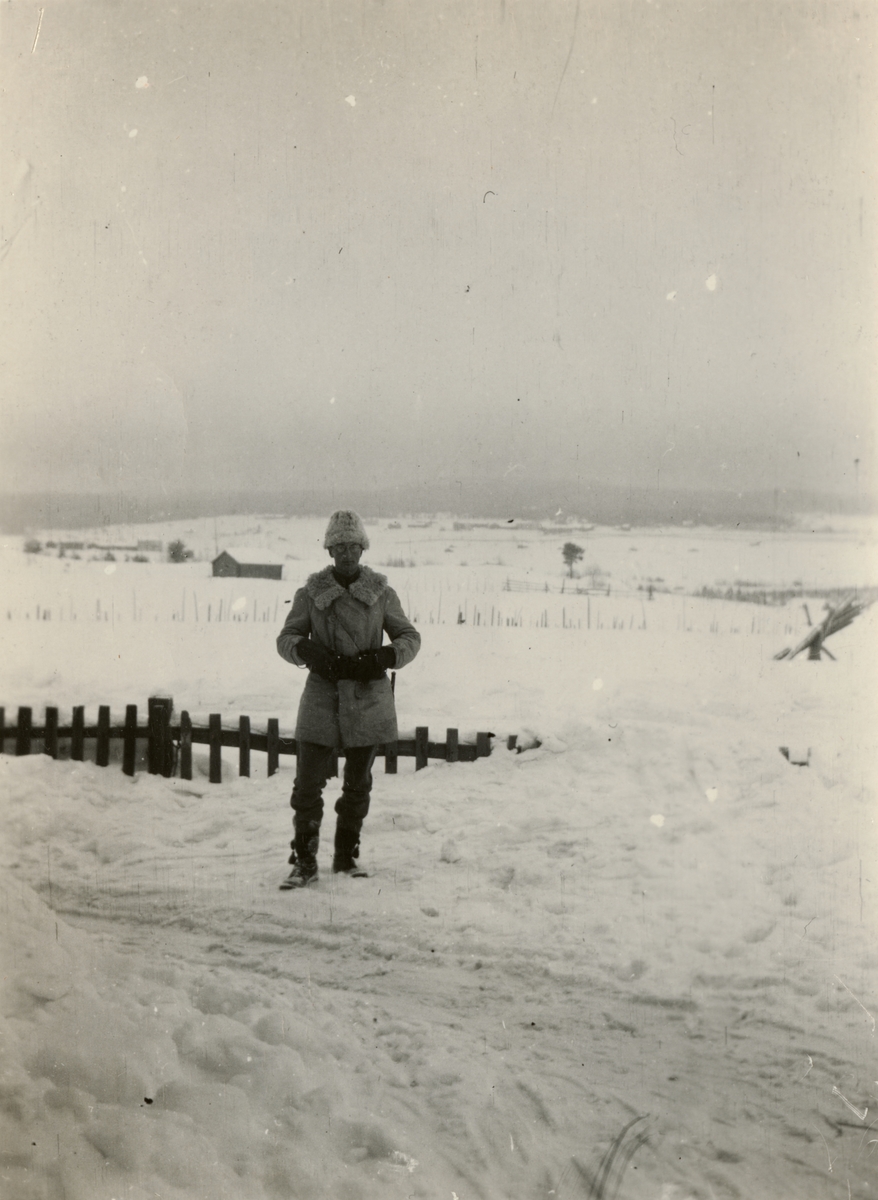 Titel: Text i fotoalbum: "Vinterövningarna vid Umeå 1916. Ego."