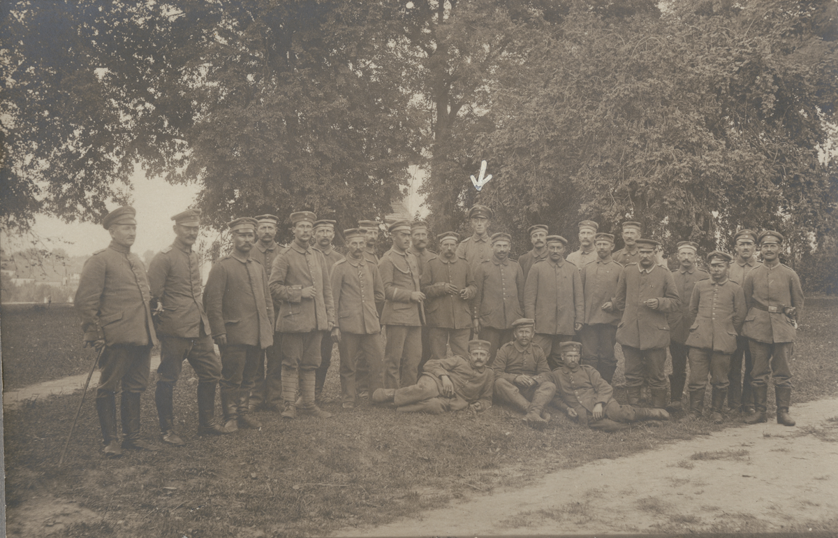 Titel: Text i fotoalbum: "September 1918. Manskap af 4de kompaniet i parken i Miropol."