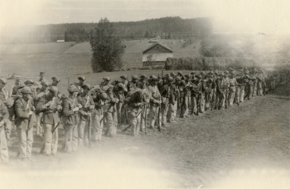 Text i fotoalbum: "Sommarövningar i Lit aug. 1929. Ränsel på!".