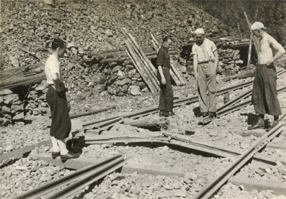 Text i fotoalbum: "3-20 juni 1937 deltog jag i en sprängkurs vid Gyttorp, där vi fick lära oss allt om sprängmedels handhavande. Järnvägen har sprängts".