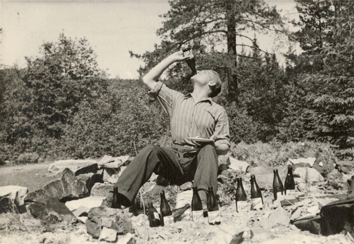 Text i fotoalbum: "3-20 juni 1937 deltog jag i en sprängkurs vid Gyttorp, där vi fick lära oss allt om sprängmedels handhavande. Man blir lätt törstig av att ladda hela dagen".