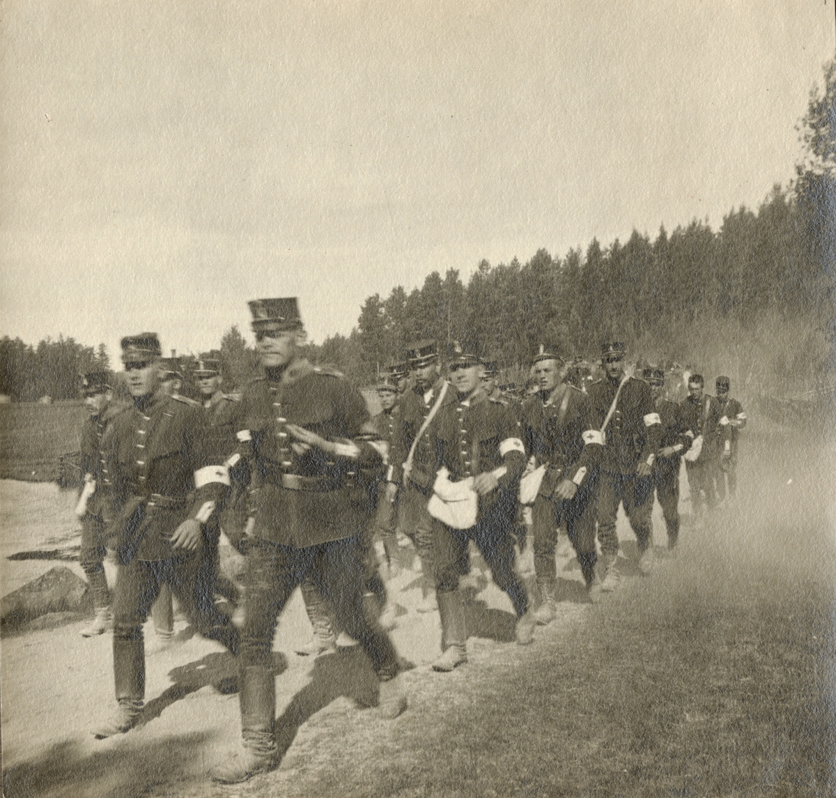 Titel: Sjukvårdstruppen marscherar på landsväg.