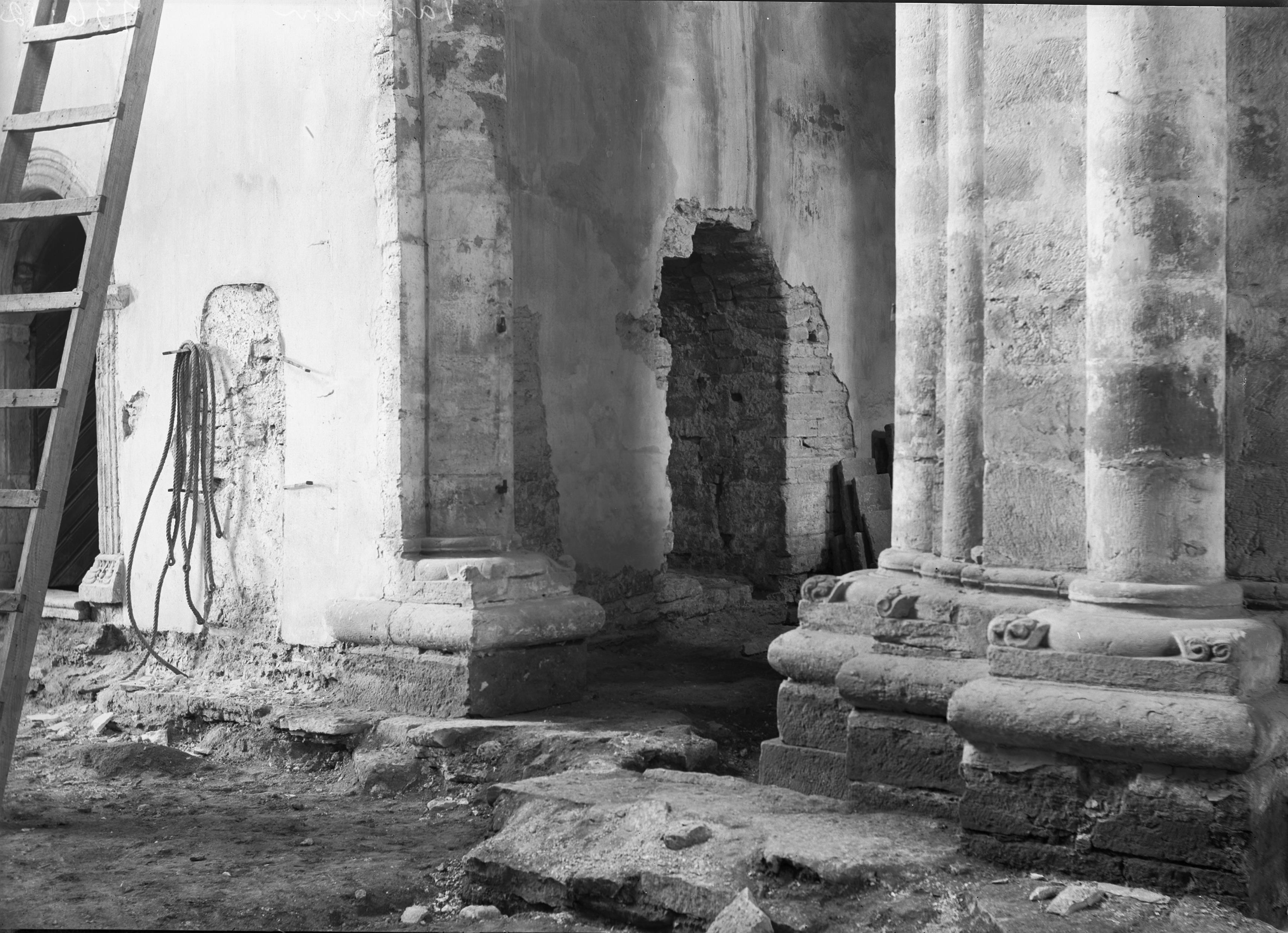 Nedre delen av koromgångens norra ingång, från sydväst. Pelarbaserna och deras grunder blottade.