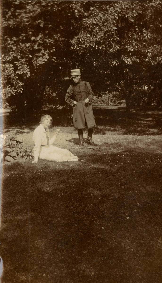 Titel: En soldat och en kvinna i park.