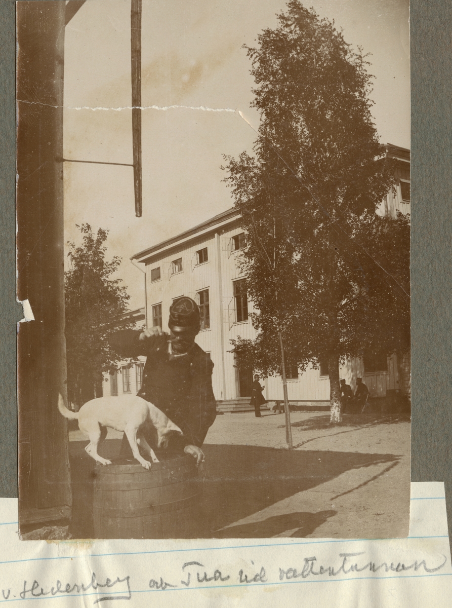 Kasernmiljö vid Hälsinge regementes övningsplats Mohed. I förgrunden en officerade med sin hund vid vattentunnan.