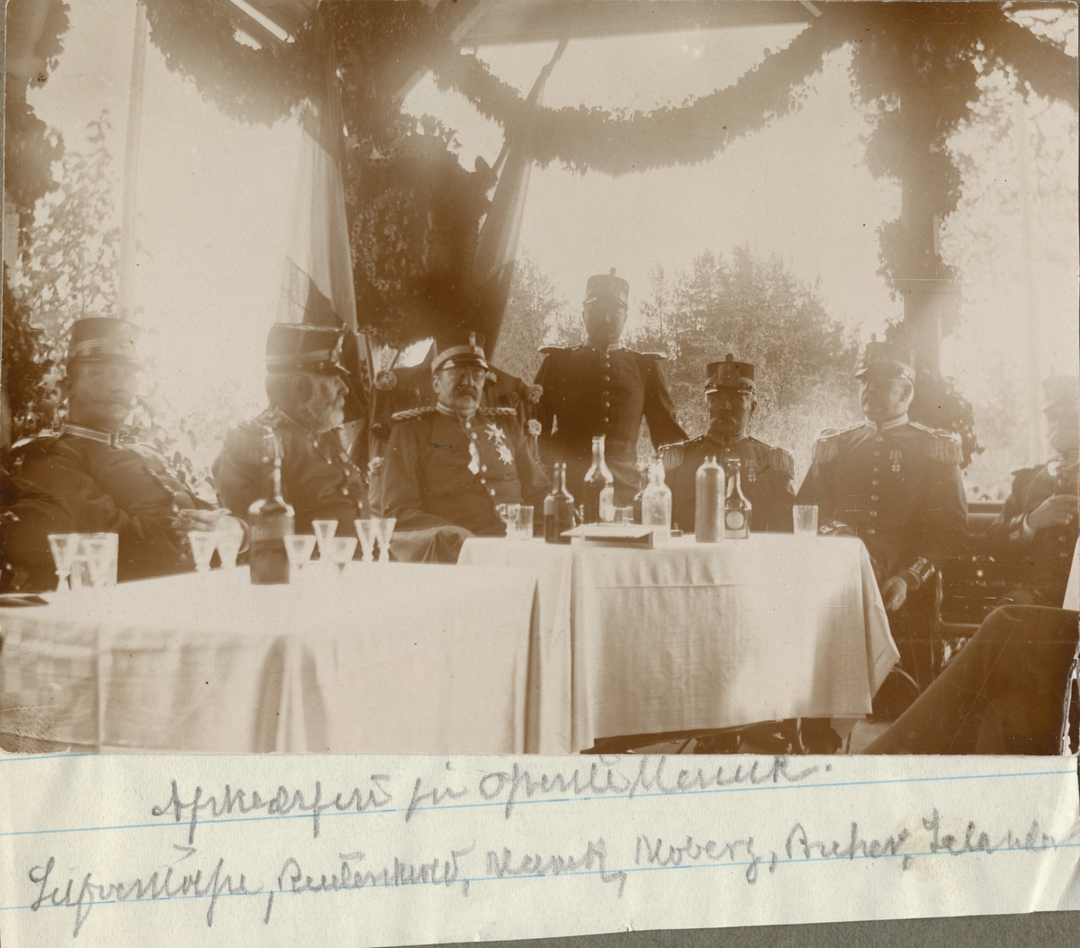 En grupp officerare vid Hälsinge regemente samlade till fest. Från vänster: kapten Silfverstolpe, överstelöjtnant Reuterskiöld, överste Munck, kapten Moberg, major Brehmer, major Selander.