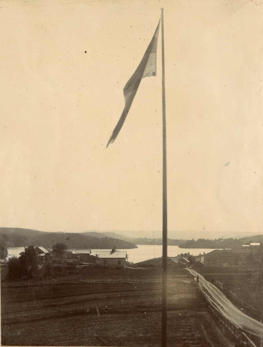 Titel: Naturvy. med svenska flaggan i förgrunden.