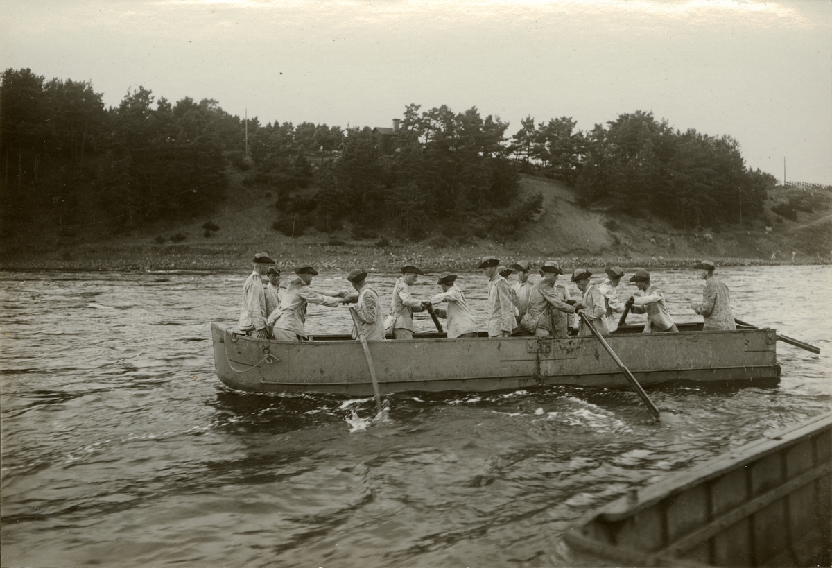 Titel: Elever från Krigsskolan Karlberg bygger pontonbro över vattendrag.