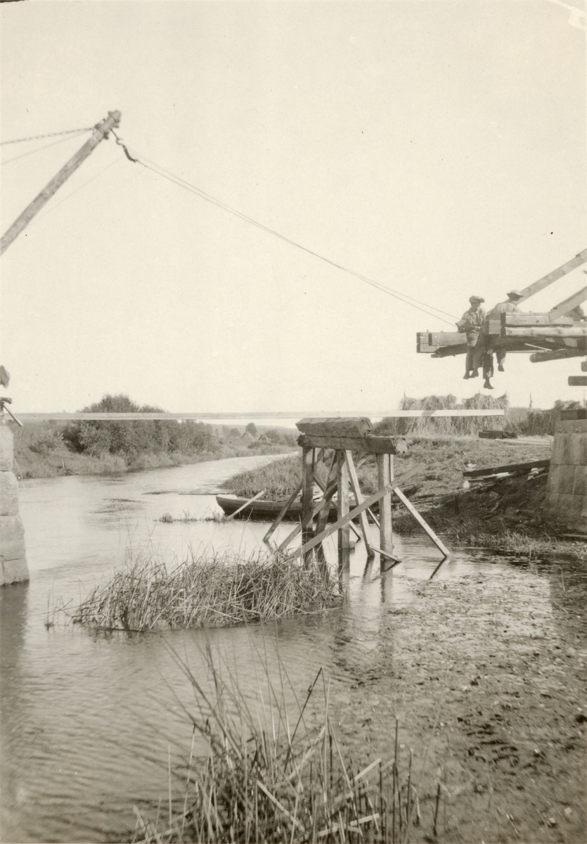 Titel: Text i fotoalbum: "Brobygget vid Gripenberg. Nya spannet vindas ut på sin plats."