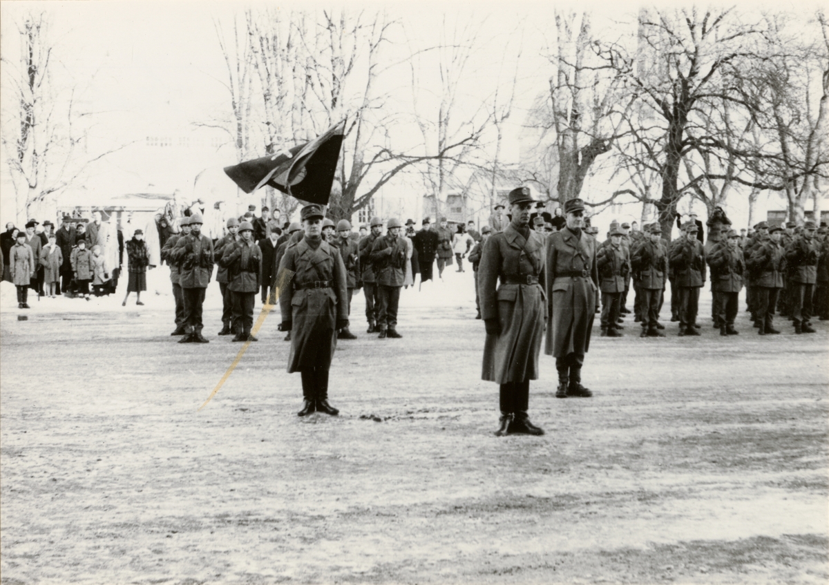 Text i fotoalbum: "Avskedesparaden 10 mars 1957. Kungl. Upplands regemente berett för avlämning den 10/3 1957".