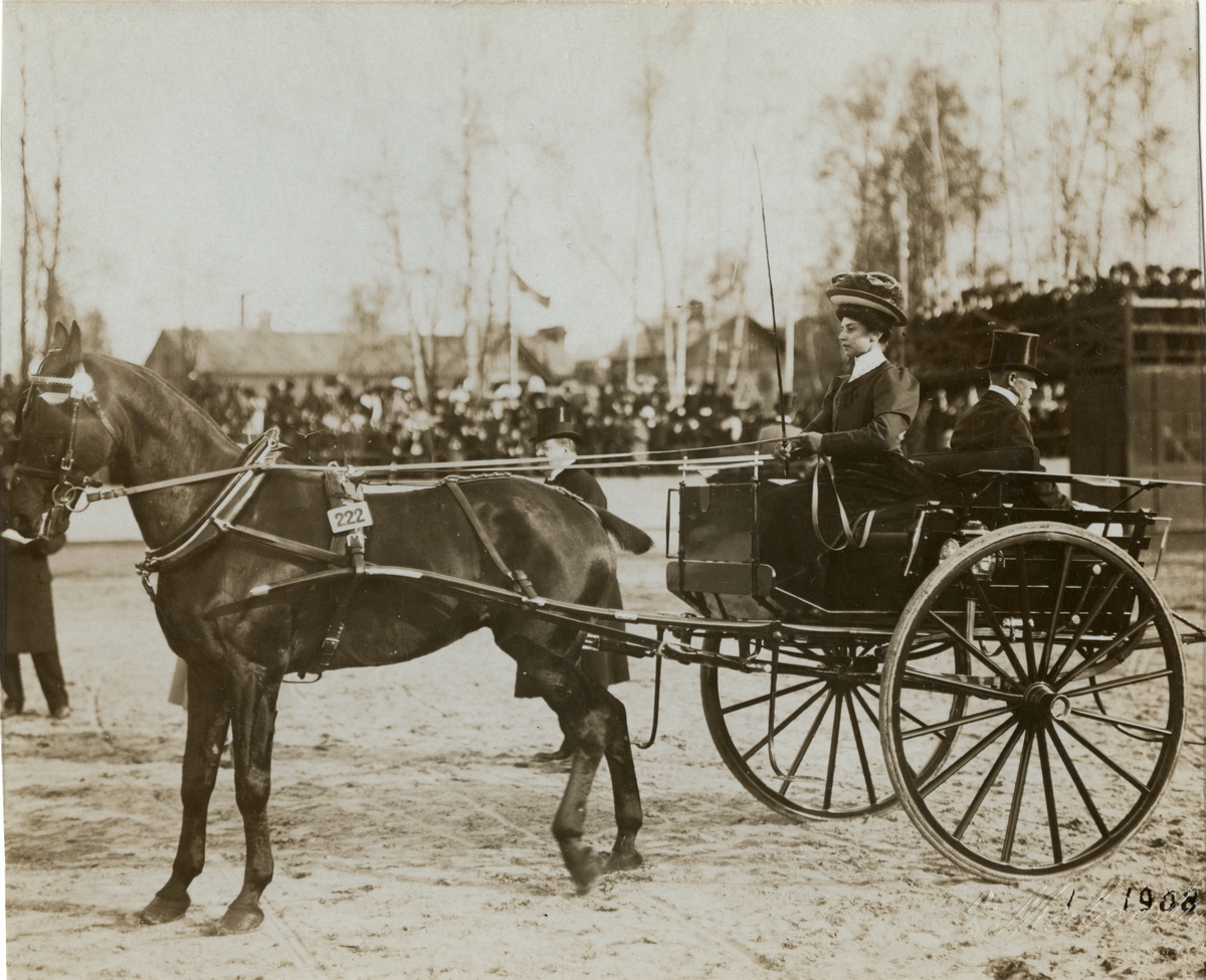 Titel: Gertrud Magnus (gift Trägårdh 1906) kör häst med vagn.