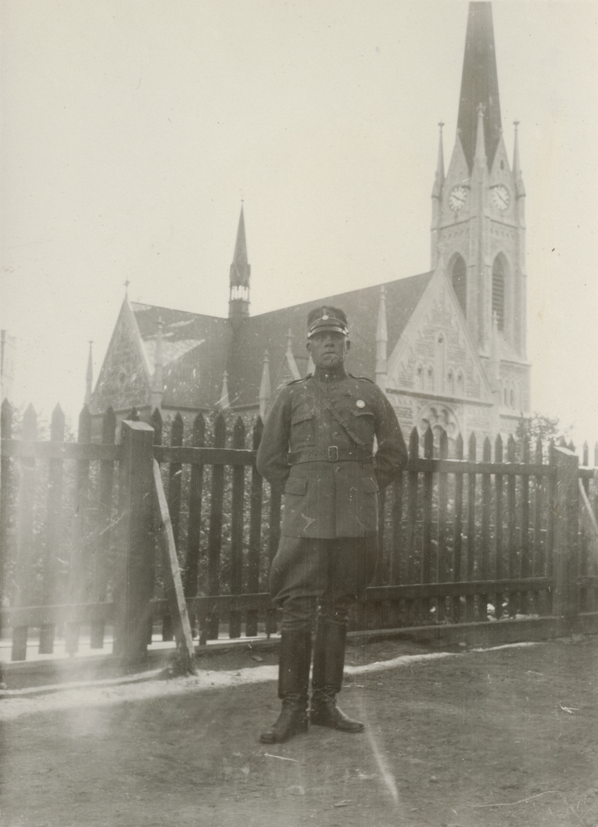Titel: En soldat framför Oscarskyrkan i Stockholm på Narvavägen 6.