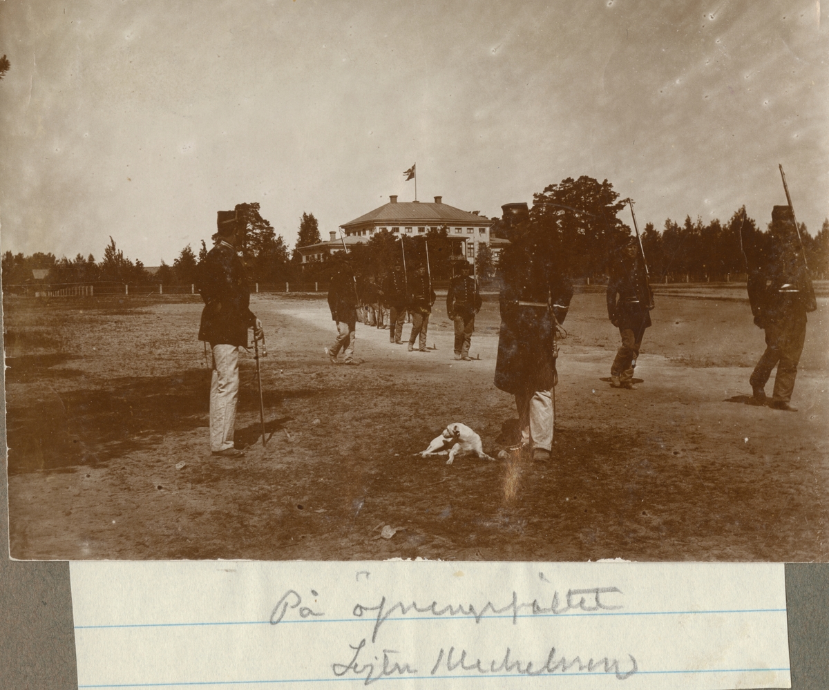 Titel: Två officerare från Hälsinge regemente på övningsfältet Mohed. I bakgrunden marscherande soldater.