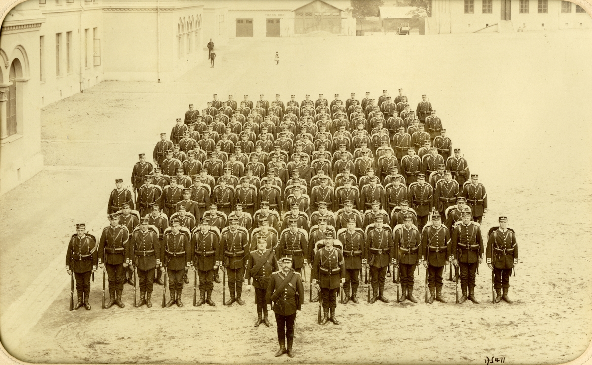 Grupporträtt av skolkompani vid Andra livgardet (Göta livgarde I 2) 1891.