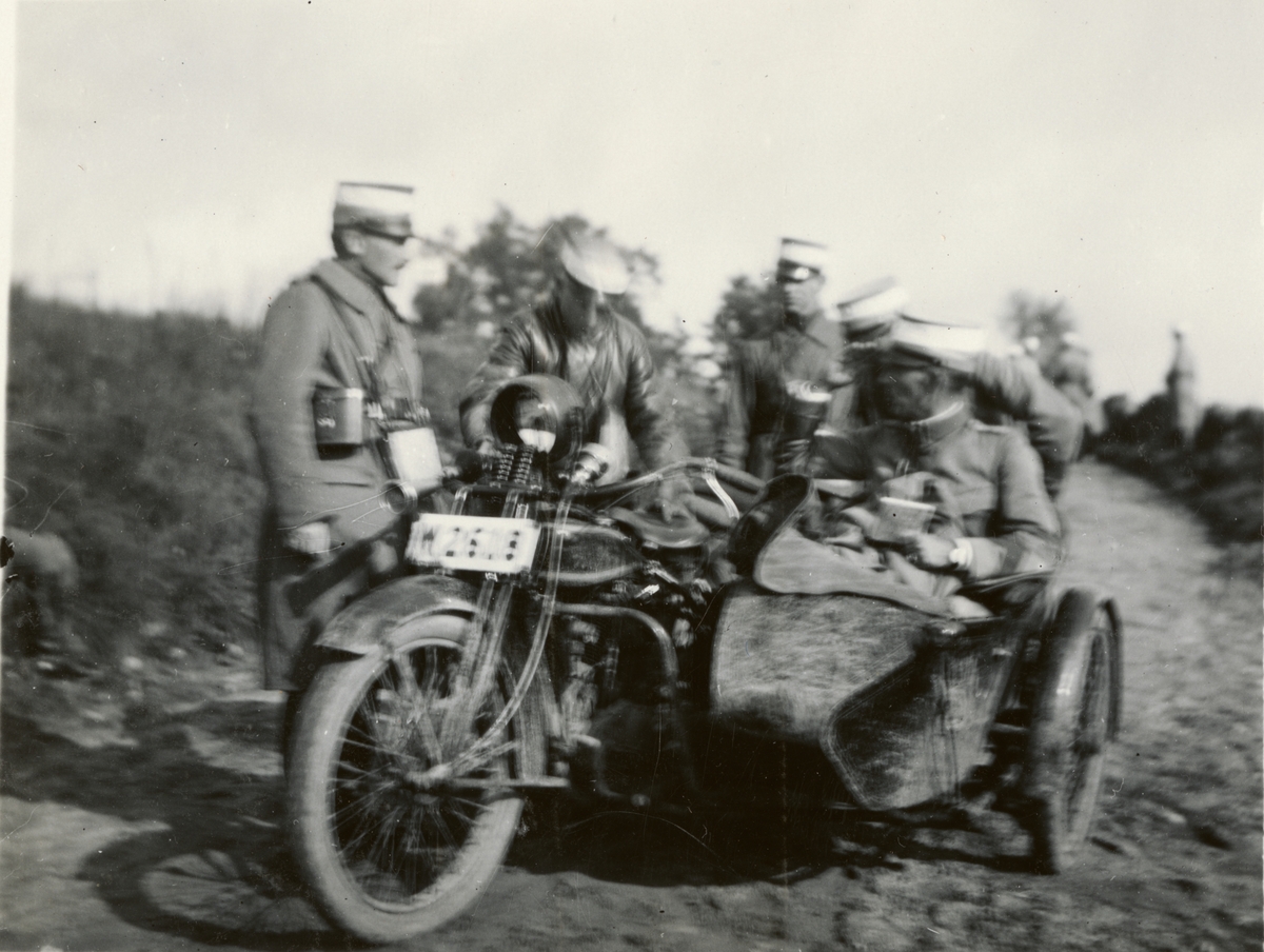 Titel: Text i fotoalbum: "Förbindelsekursen 1920". Samling vid motorcykel.