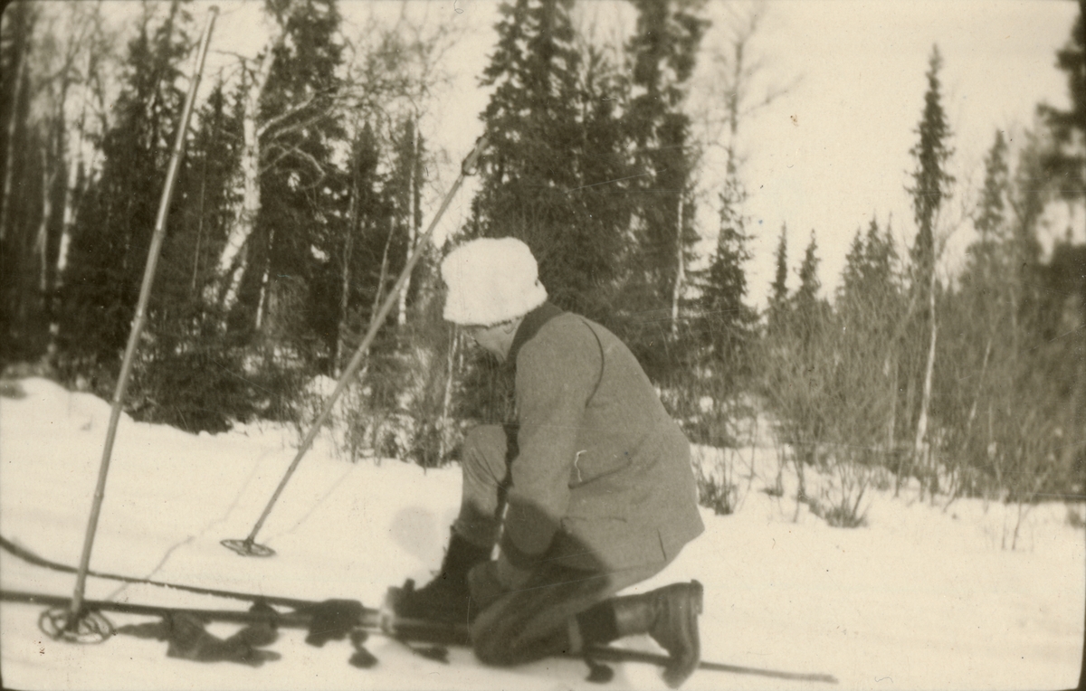 Titel: Soldat sätter på sig skidor.