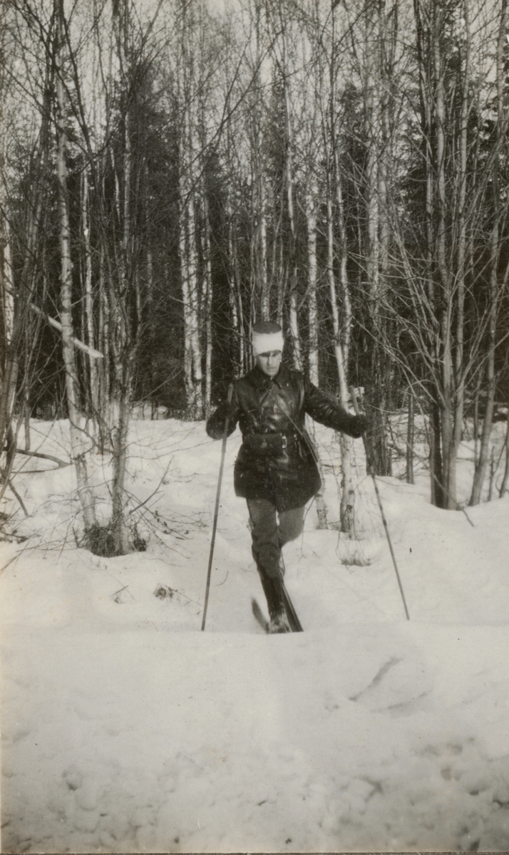 Titel: En soldat från Göta livgardes stridsvagnsbataljon åker skidor.