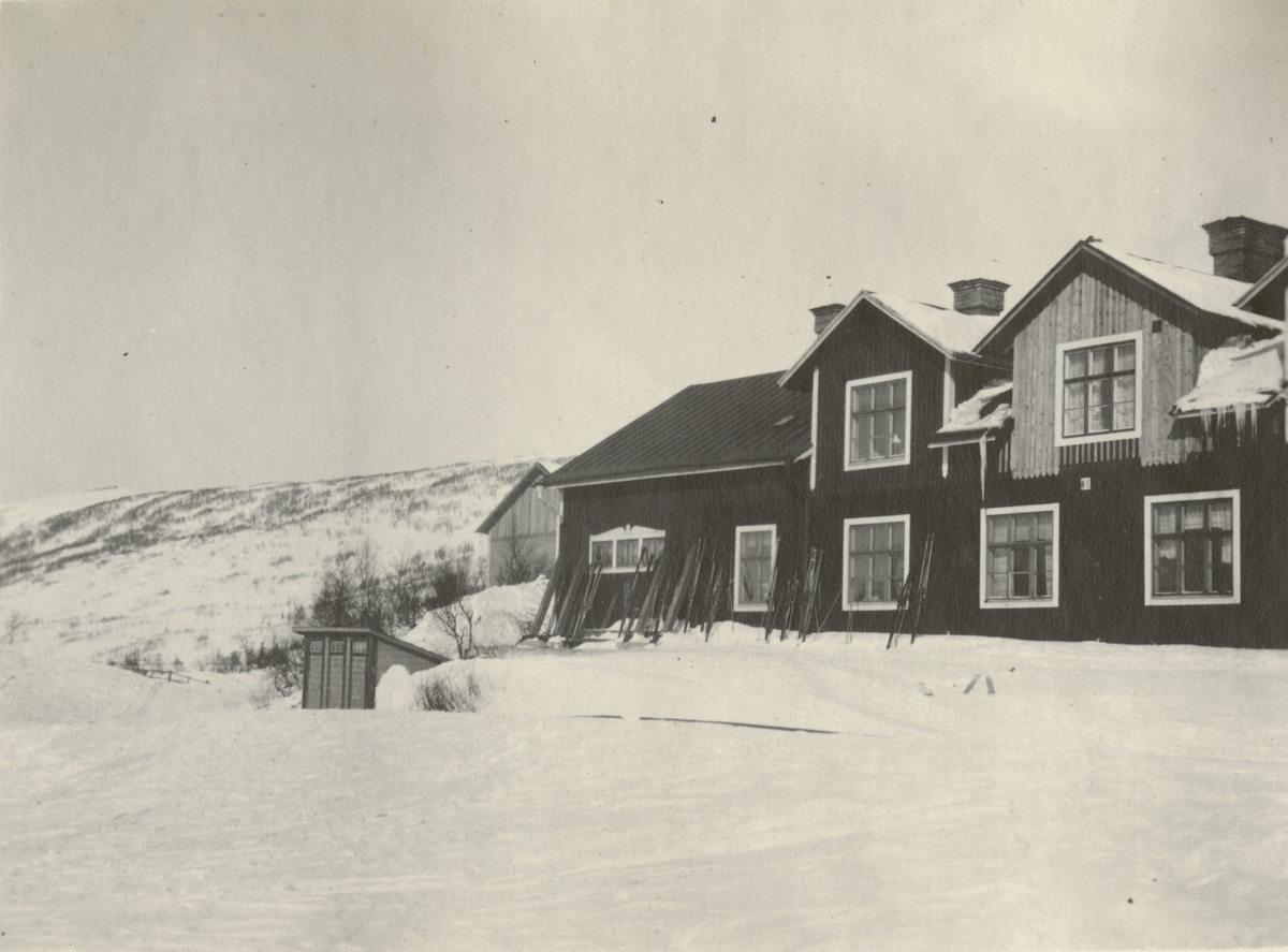 Ett trähus i fjällen med skidorna ställda mot husets framsida. Framför huset finns en mindre byggnad. Bakom huset syns en kortsida till ytterliga ett trähus.
