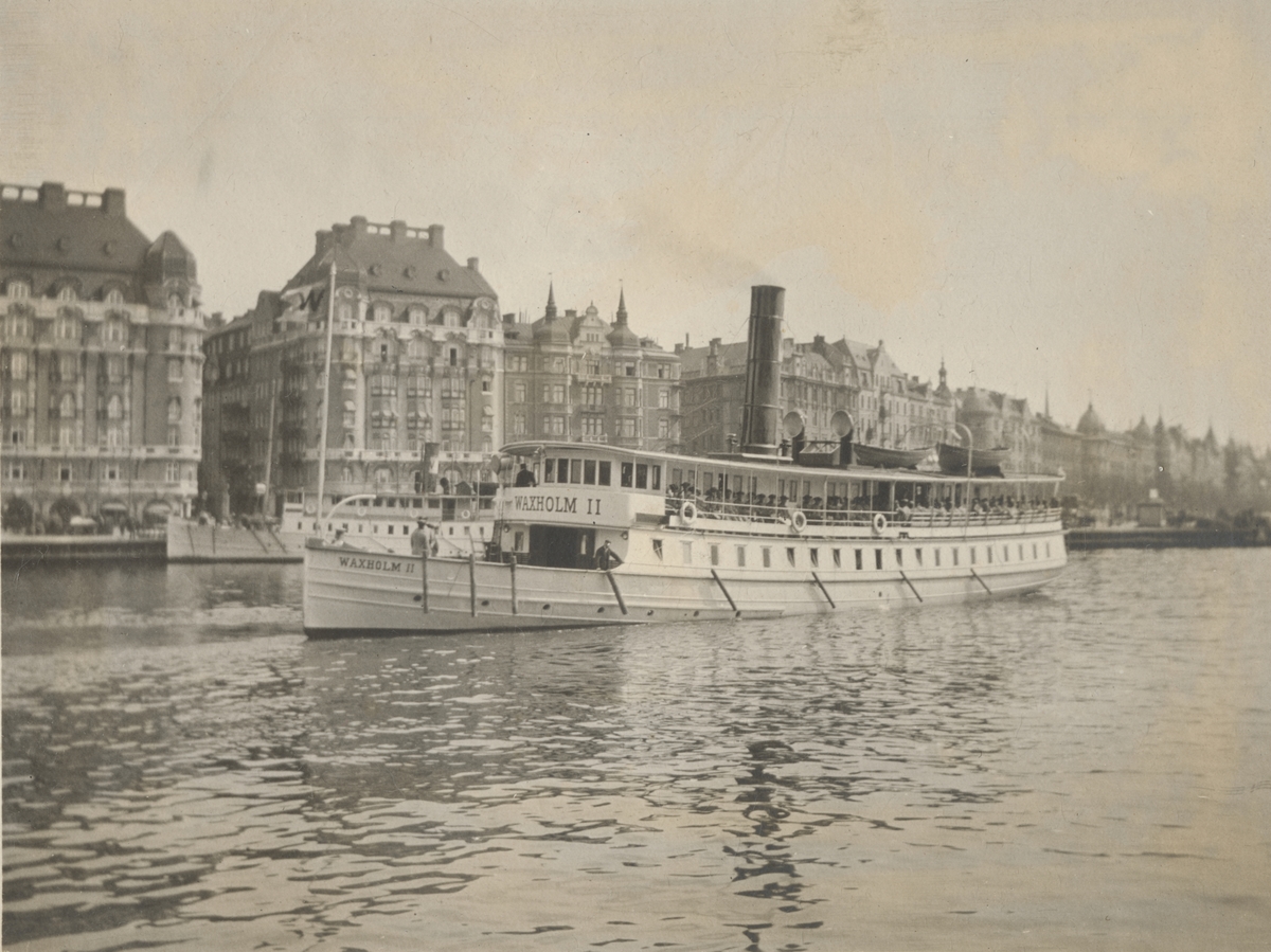 Titel: Båten Vaxholm II anländer till kajen i Nybroplan.
