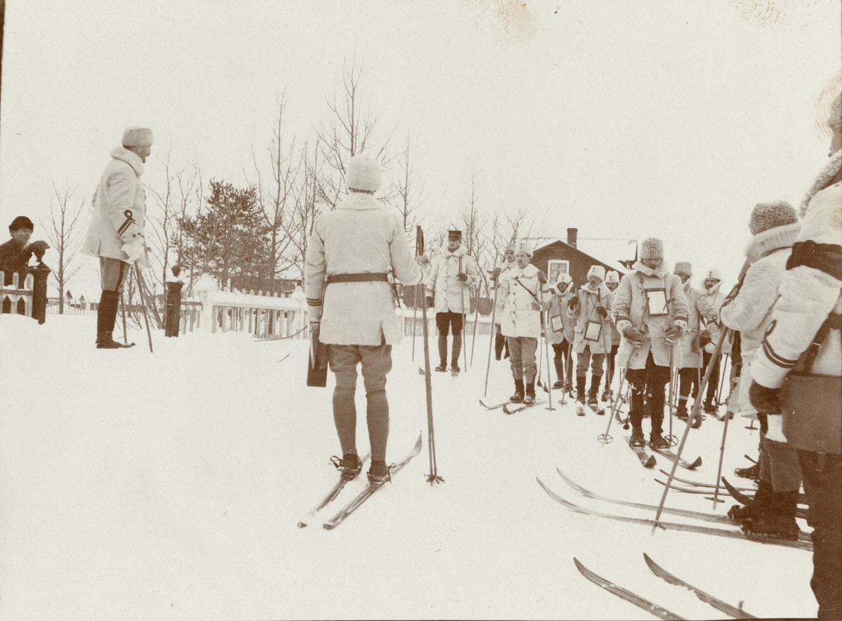 Smålands husarregemente K 4 på skidor, vinterövning i Norrbotten omkring 1910.