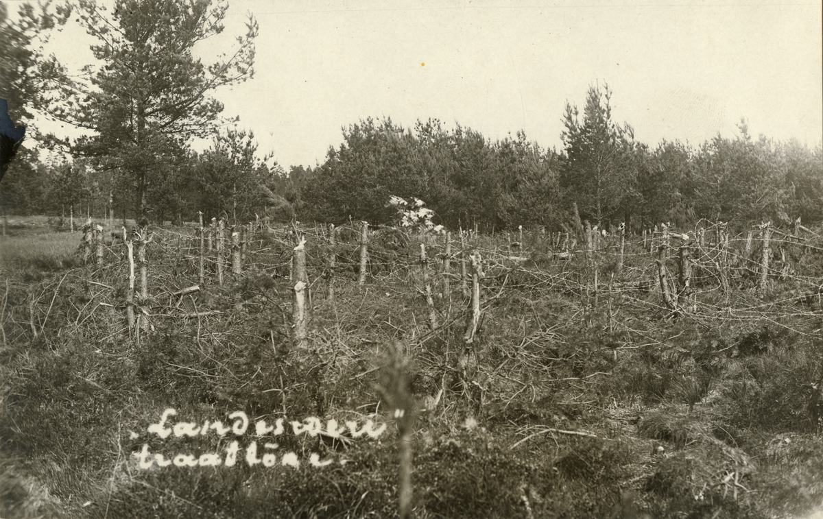 Titel: Text i fotoalbum: "Taggtråd vid Riga-fronten."