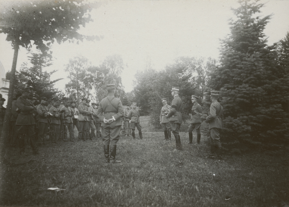 Stridsvagnskursen vid Göta livgardes stridsvagnsbataljon samlade för genomgång. Bland soldaterna finns även besökande tyska officerare.
