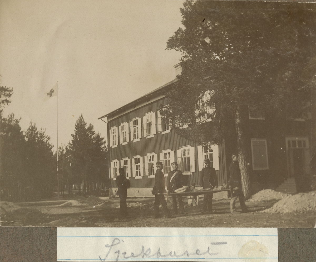 Titel: Sjukvårdspersonal bär en soldat på bår. Bakgrunden finns regementets sjukhus.