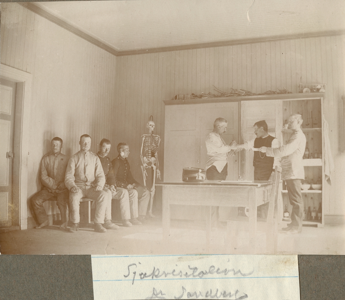 Titel: Doktor Sandberg med assistent undersöker en patient. Fyra soldater sitter på en bänk och väntar sin tur.