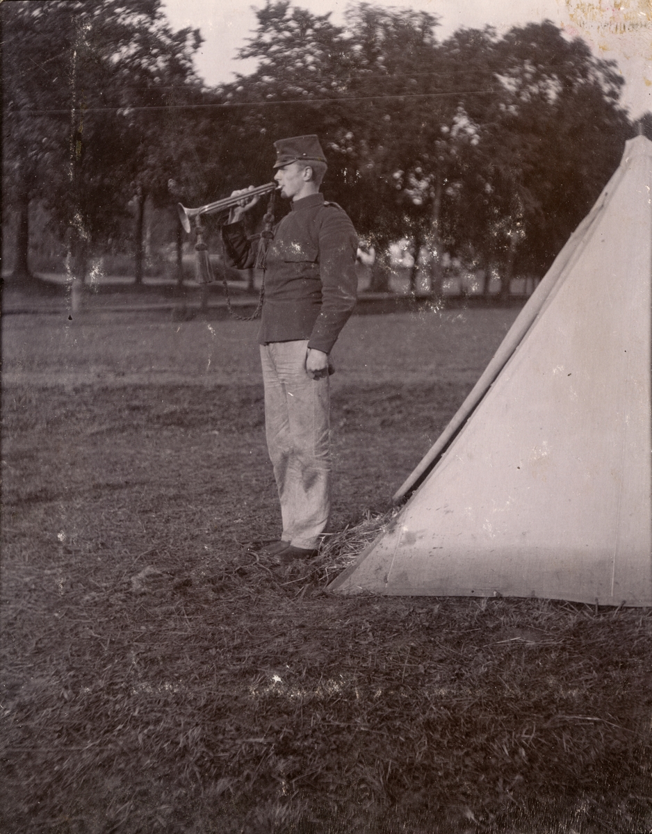 Titel: Soldat från Fortifikationen blåser trumpet utanför tält.